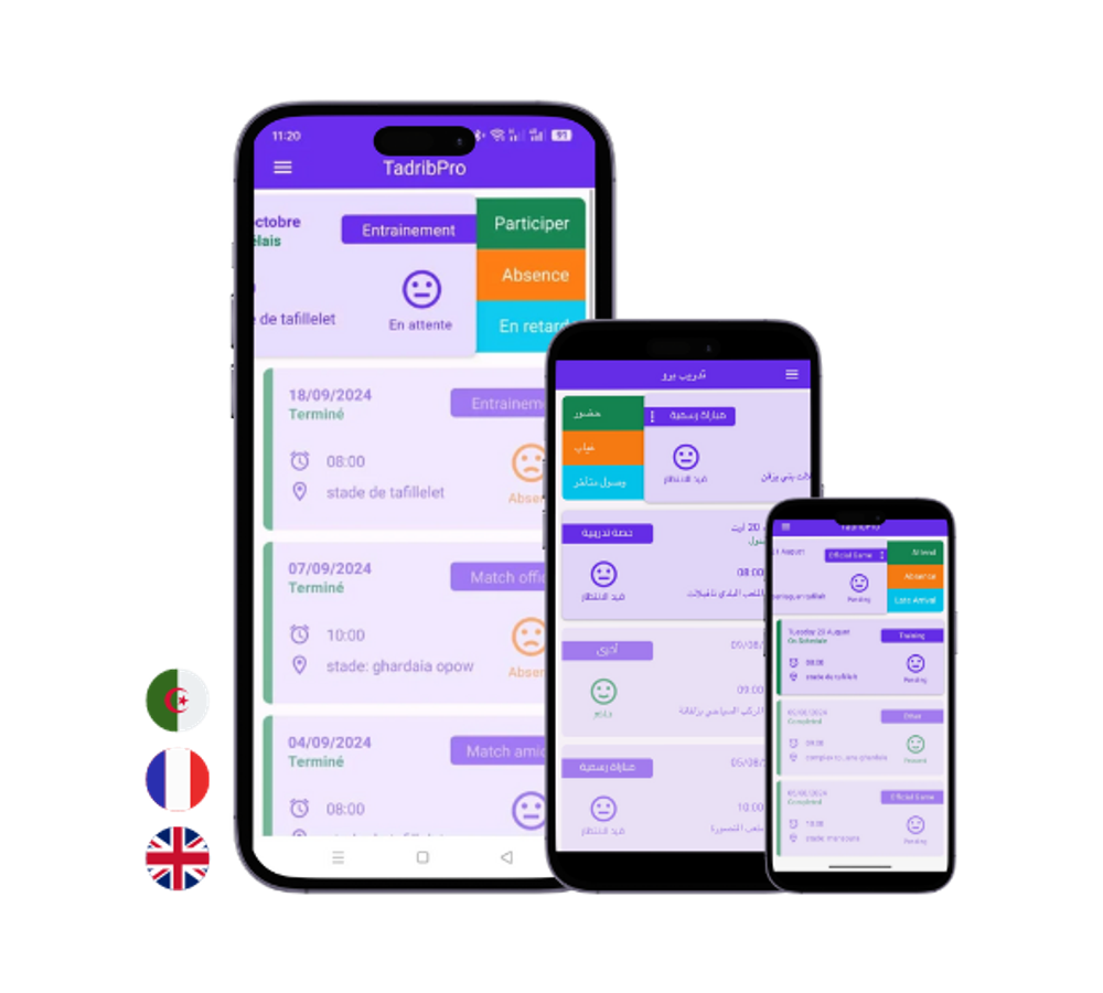 يتوفر تطبيقنا بثلاث لغات – الإنجليزية، الفرنسية، والعربية – مما يجعل من السهل على الوالدين من مختلف الخلفيات استخدامه. ابقَ على اتصال وشارك بفاعلية في رحلة طفلك الرياضية، بغض النظر عن الحواجز اللغوية.